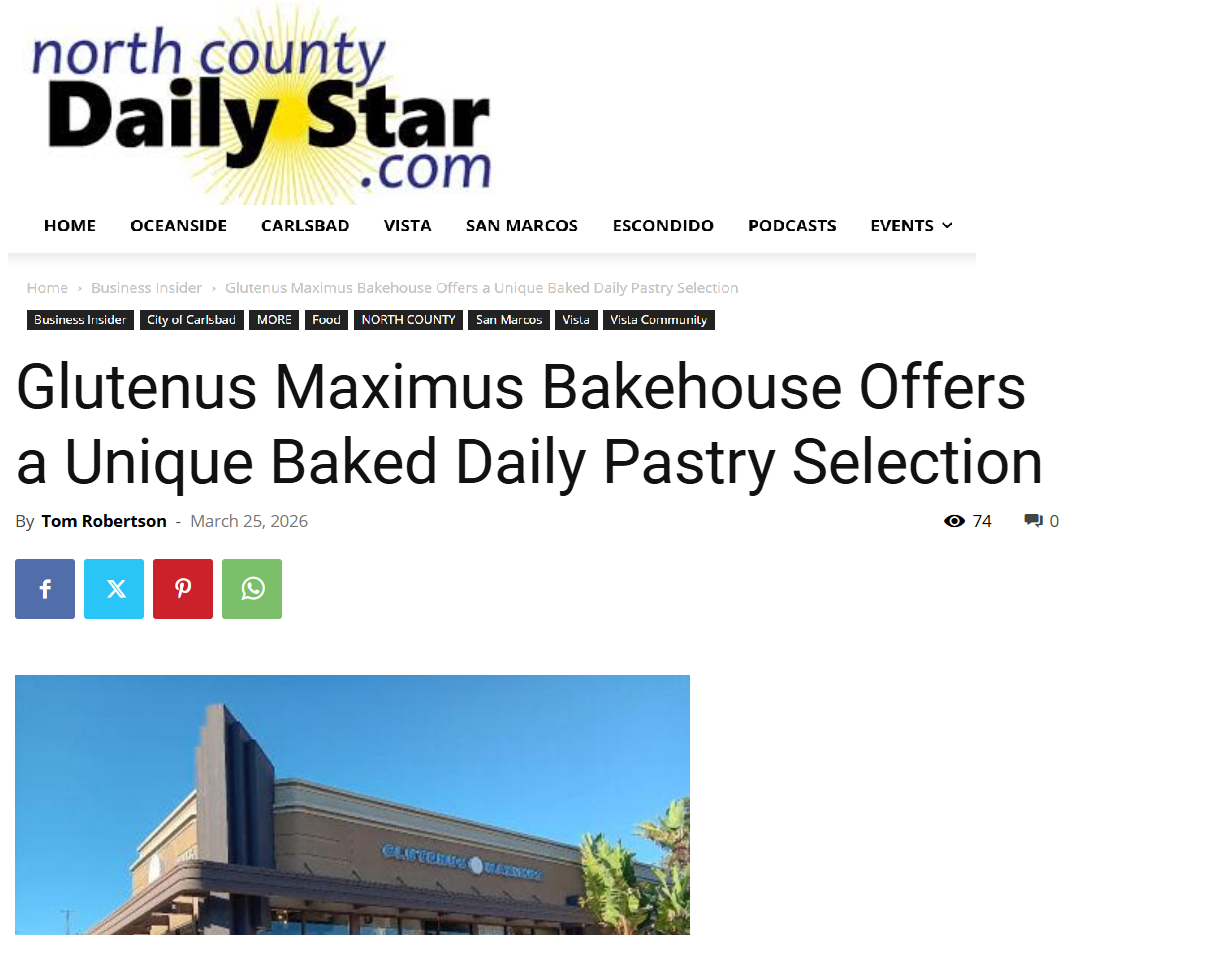 “Glutenus Maximus owner Hunter Barrera has worked in kitchens most of his life so eventually becoming a business owner of his own bakery is no surprise and what an amazing bakery does he own. Open for two years now, Glutenus Maximus is becoming a go-to place for delicious baked daily pastry items every day for numerous North County Residents… What makes Glutenus Maximus so unique is their specialty is not the traditional looking donut but is Croissants and a variety of Croissants called Cronuts and Cruffins.”